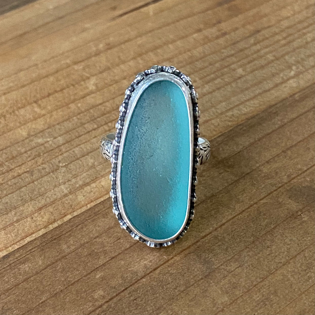 Capture the serene beauty of the ocean with this enchanting teal sea glass ring. Genuine sea glass—nature's polished treasure—takes center stage, cradled within an intricate sterling silver daisy wreath that evokes a peaceful garden aesthetic. The delicate floral detailing frames your stone perfectly, creating a romantic, nature-inspired piece that feels both timeless and whimsical. Ideal for those who cherish coastal charm and artisanal craftsmanship.