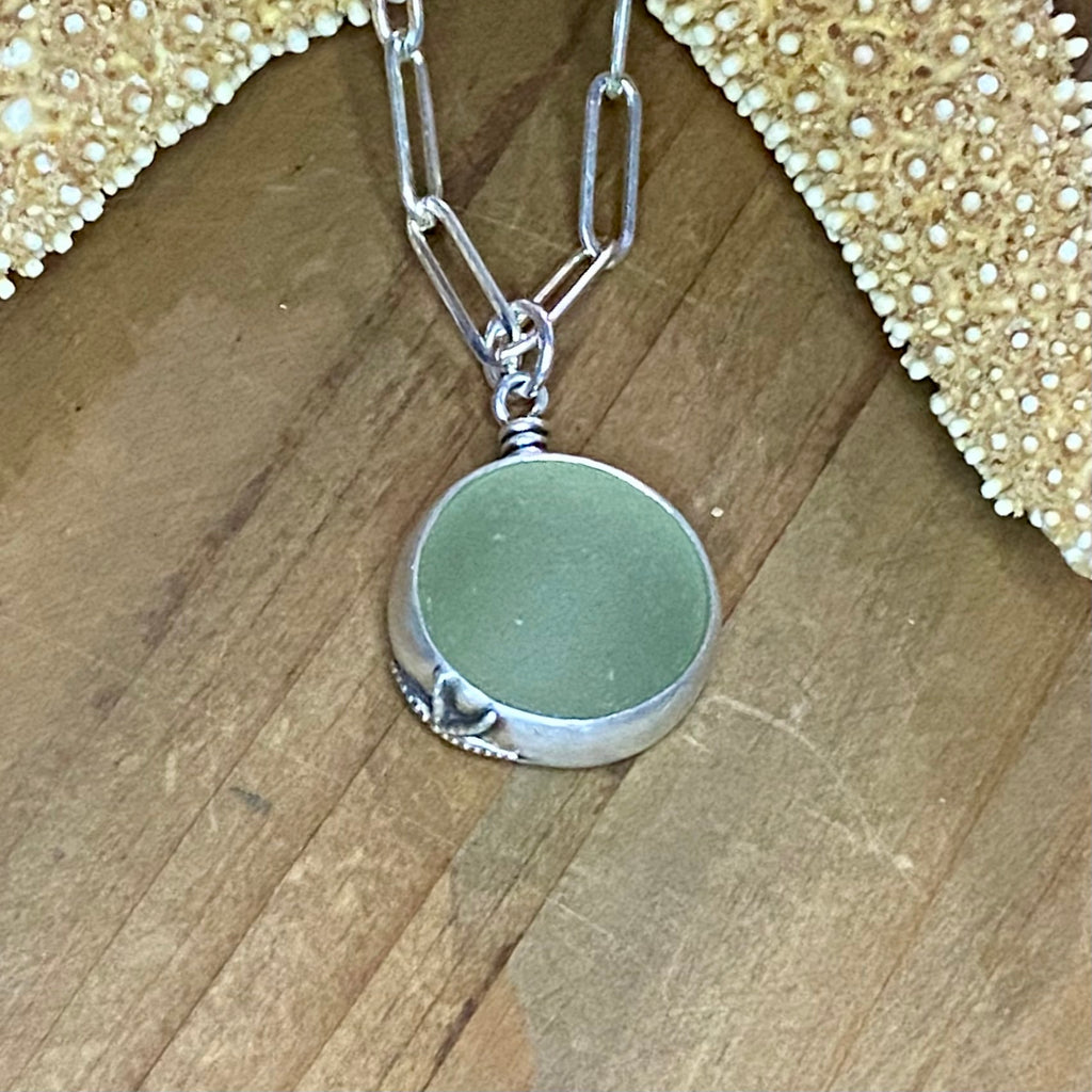 Signature Pale Olive Green Sea Glass Marble Pendant— Sterling Silver