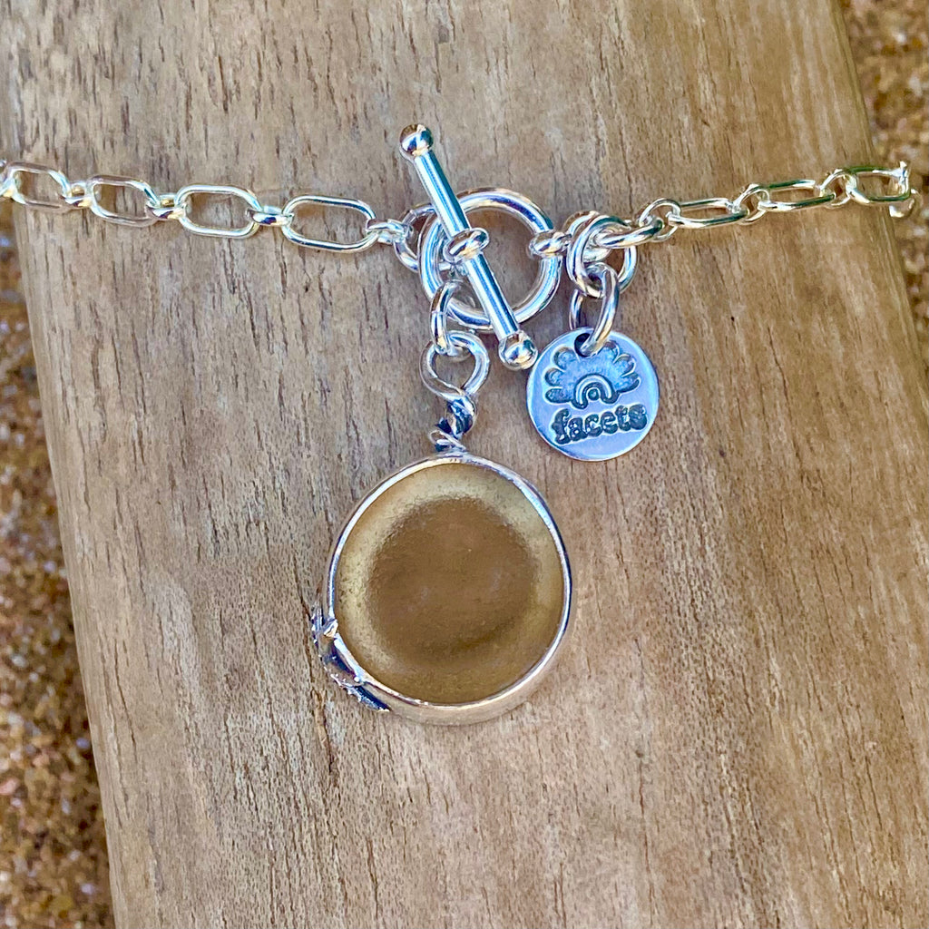 This rare and vintage peach colored pendant features an ocean tumbled Ohajiki piece from a popular Japanese children's game. This unique find has a secret worn number pressed into the glass! Set in a signature sea star bezel, and finished with an oval link chain (measuring 18") and toggle clasp, it is sure to set you and your wardrobe apart from crowd when wearing this beautiful sterling silver pendant!