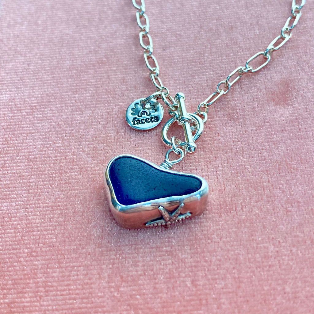 Capture the ocean's magic with this stunning sterling silver necklace featuring a heart-shaped cobalt blue artist sea glass centerpiece set in our signature style bezel. The rich, jewel-toned glass—a rare find from nature's own collection—becomes a wearable treasure when framed in polished silver. Secured by a graceful toggle chain, this piece effortlessly transitions from everyday elegance to special occasion glamour. Each necklace celebrates the beauty of reclaimed sea glass, making it as unique as the wearer. Perfect for those who appreciate artisan craftsmanship and ocean-inspired jewelry with genuine character. (approx 18")